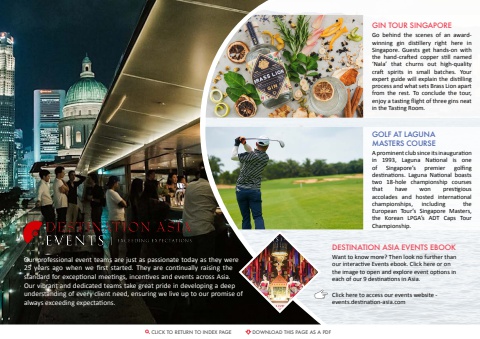CLICK TO RETURN TO INDEX PAGE DOWNLOAD THIS PAGE AS A PDFClick here to access our events website - events.destination-asia.comDESTINATION ASIA EVENTS EBOOKWant to know more? Then look no further than our interactive Events ebook. Click here or on the image to open and explore event options in each of our 9 destinations in Asia.GIN TOUR SINGAPOREGo behind the scenes of an awardwinning gin distillery right here in Singapore. Guests get hands-on with the hand-crafted copper still named %u2018Nala%u2019 that churns out high-qualitycraft spirits in small batches. Your expert guide will explain the distilling process and what sets Brass Lion apart from the rest. To conclude the tour, enjoy a tasting flight of three gins neat in the Tasting Room.GOLF AT LAGUNAMASTERS COURSE A prominent club since its inaugurationin 1993, Laguna National is one of Singapore%u2019s premier golfing destinations. Laguna National boaststwo 18-hole championship coursesthat have won prestigious accolades and hosted international championships, including theEuropean Tour%u2019s Singapore Masters, the Korean LPGA%u2019s ADT Caps Tour Championship.Our professional event teams are just as passionate today as they were 25 years ago when we first started. They are continually raising the standard for exceptional meetings, incentives and events across Asia. Our vibrant and dedicated teams take great pride in developing a deep understanding of every client need, ensuring we live up to our promise of always exceeding expectations.