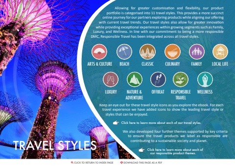CLICKTORETURNTOINDEXPAGEDOWNLOADTHISPAGEASAPDFTRAVELSTYLESARTS&CULTURENATURE&ADVENTUREBEACHLUXURYOFFBEATRESPONSIBLETRAVELWELLNESSCLASSICCULINARYFAMILYLOCALLIFEAllowingforgreatercustomisationandflexibility,ourproductportfolioiscategorisedinto11travelstyles Thisprovidesamoresuccinctonline journey for ourpartners exploringproducts while aligning our offeringwithcurrenttraveltrendsOurtravelstylesalsoallowforgreaterinnovationwhileprovidingexceptionalexperiences within growing segments suchasFamily,Luxury,andWellnessInlinewithourcommitmenttobeingamoreresponsibleDMCResponsibleTravelhasbeenintegratedacrossalltravelstylesWealsodevelopedfourfurtherthemessupportedbykeycriteriatoensurethetravelproductswelabelasresponsiblearecontributingtoasustainablesocietyandplanetKeepaneyeoutfor these travelstyleiconsasyouexplore theebookForeachtravelexperiencewehaveaddediconstoshowtheleadingtravelstyleorstylesthatcanbeenjoyedClickheretolearnmoreabouteachofourresponsibleproductthemesClickheretolearnmoreabouteachofourtravelstyles